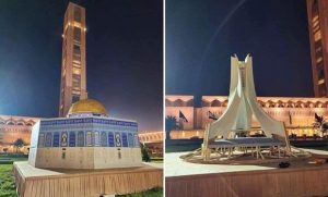 Une reproduction du Dôme du Rocher, mosquée emblématique érigée à proximité de la mosquée d’Al-Aqsa à El Qods occupée, fait face à Djamâa El-Djazaïr tout en étant visible depuis l’un des principaux axes routiers de la capitale.