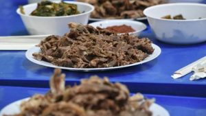 La viande de chien, rouge et grasse, systématiquement bouillie pour la rendre plus tendre. Elle est généralement consommée comme un mets estival, étant censée aider à supporter la chaleur.